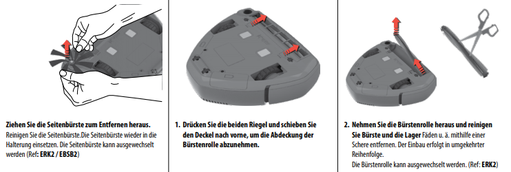- Nehmen Sie die Seitenbürste durch ziehen ab, die Befestigung ist magnetisch (siehe Abbildung unten links).