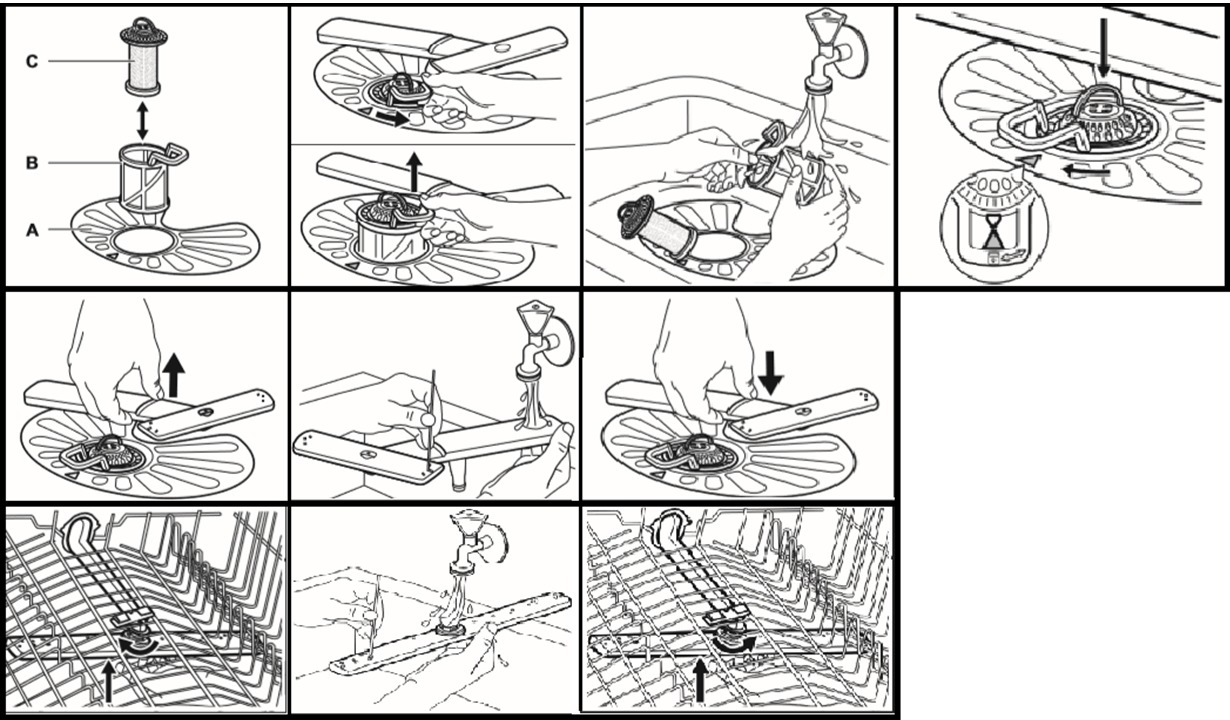 - Überprüfen und reinigen Sie die Siebe und Sprüharme.