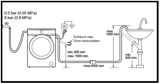 - Der Ablaufschlauch sollte nicht mehr als 10 cm in den Ablauf hineinragen.
