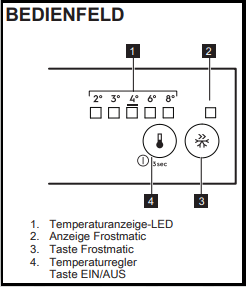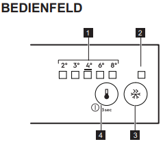 Dopo questi cinque secondi, l'illuminazione interna si riaccende automaticamente e si accende un solo LED sulla scala della temperatura, dopodiché il dispositivo di raffreddamento riprende a raffreddarsi automaticamente dopo un po'.