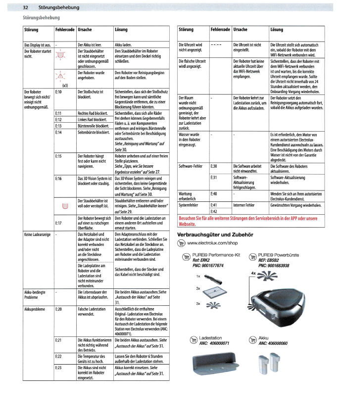 Sollte ein Fehler auftreten, unterbricht der Roboter den Reinigungsvorgang. Gleichzeitig gibt der Roboter in der eingestellten Sprache die Fehlermeldung per Audiomeldung durch. Das Warnsymbol blinkt und die Buchstabe “E:” gefolgt von einem Fehlercode werden auf dem Display angezeigt.