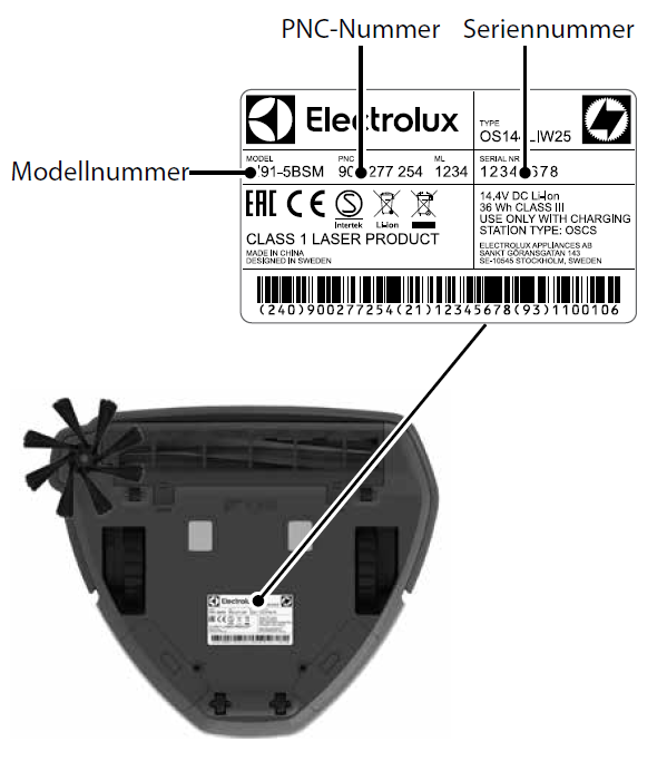 Sie finden diese Angaben auf dem Typenschild, welches sich bei den Saugroboter auf der unterer Seite befindet (siehe Beispiel unten).