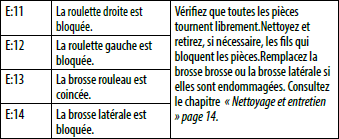 Durant le nettoyage, de la saleté, des cheveux, des fils de tissu et d'autres objets peuvent s'enrouler autour des roues, de la brosse rouleau ou brosse latérale de l'aspirateur robot. La mobilité de l'aspirateur et de ses brosses est restreinte et peut entraîner les messages d'erreur E11, E12, E13, E14.