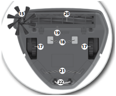 - Eliminez les cheveux, les fils de tissu, les cordons, les morceaux de film plastique, etc. des roues principales (voir n°17 sur la description ci-dessous à gauche).