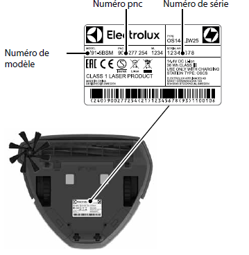 Vous trouverez ces informations sur la plaque signalétique, située sous l'aspirateur robot (voir exemple ci-dessous).